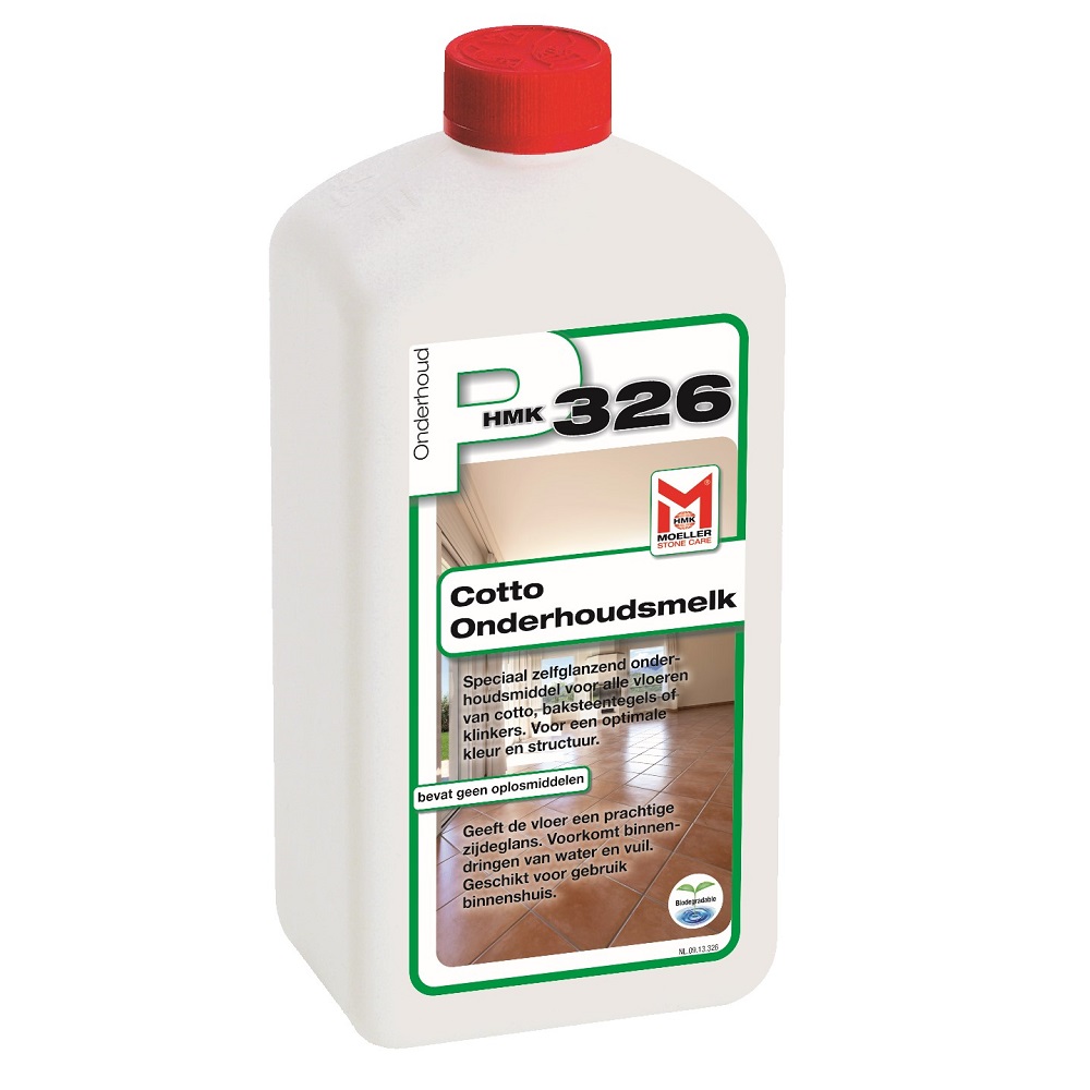 De P326 Cotto onderhoudsmelk is een onderhoudsmiddel voor vloeren van terracotta, baksteentegels, kleitegels en klinkers. Geeft een optimale kleur, structuur en een zijdeglans, zonder boenen. Werkt ook beschermend tegen water- en vuil.
